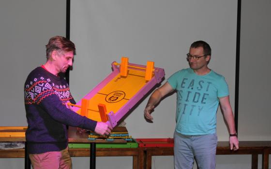 Jiří Palát a Ivo Skoček přivezli do kavárny Café Kampus na Starém Městě Pražském šest her pozoruhodných názvu: Dej kuličku do dolíčku, Práčata, Rovnovážník, Naťukni ho!, Hranoball a Kostkopád.