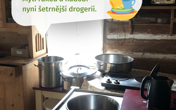 Většině z vás není potřeba vysvětlovat, proč je lepší do septiku, na konec travnaté zahrady do kopřiv nebo zkrátka kamkoli mimo kanalizaci lít vodu z mytí rukou a nádobí s prostředkem, který se odbourá a neškodí. Proto prosíme, abyste během pobytu v Dědově nepoužívali žádné vaše donesené prostředky, ale drogerii šetrnější k přírodě, která je nově k dispozici. Příroda vás bude milovat!