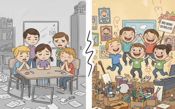 Tomíci z Hrochova Týnce z oddílu Bosá noha byli nejdříve smutní. Svět byl šedivý a činnost je tak nějak nebavila. Ale pak! Vrhli se do šablon. Bavily je – a jak. Jejich rumunský kamarád Vasile Popescu (červený s transparentem, vpravo nahoře!) byl radostí doslova bez sebe. Však je to na transparentu hezky povězeno: Hoď ekonoma do projektu. Sice nevíme, proč napsal právě to, ale i tak ho máme rádi.
